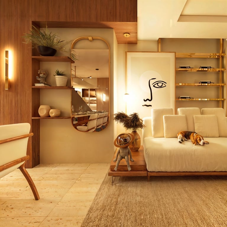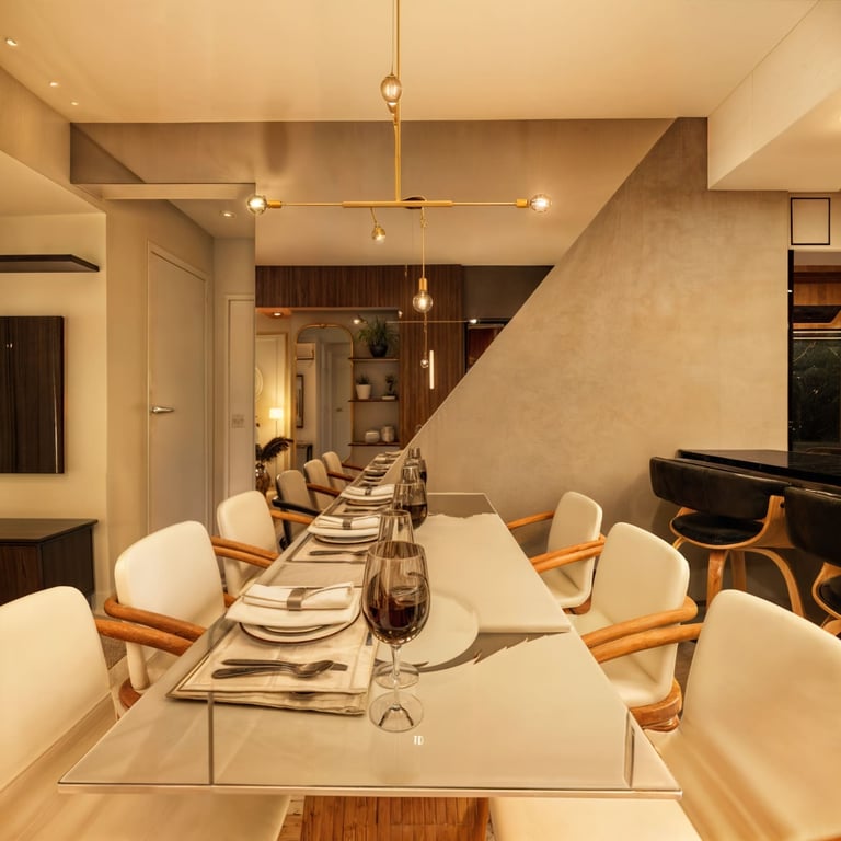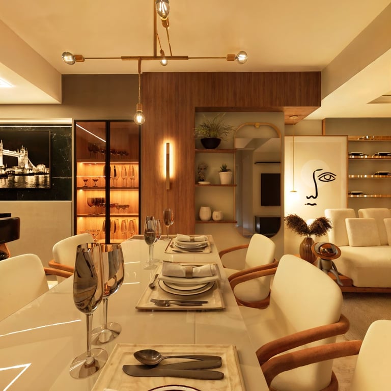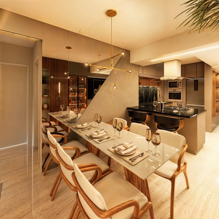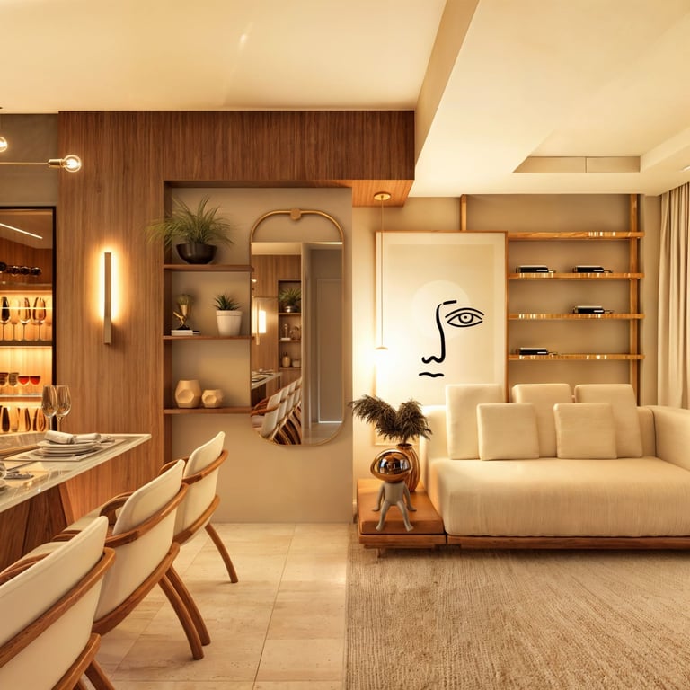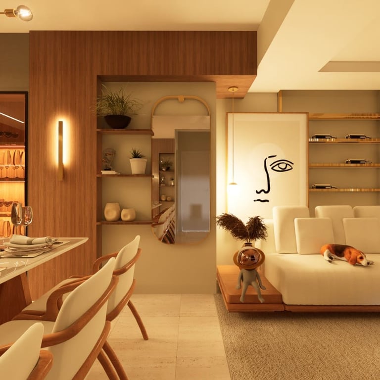 Living integrado com proposta sofisticada e atemporal, marcado por paleta neutra, texturas elegantes e marcenaria sob medida. O projeto valoriza a fluidez entre os ambientes sociais, criando um espaço acolhedor e funcional, com iluminação suave e equilíbrio entre conforto e estética.