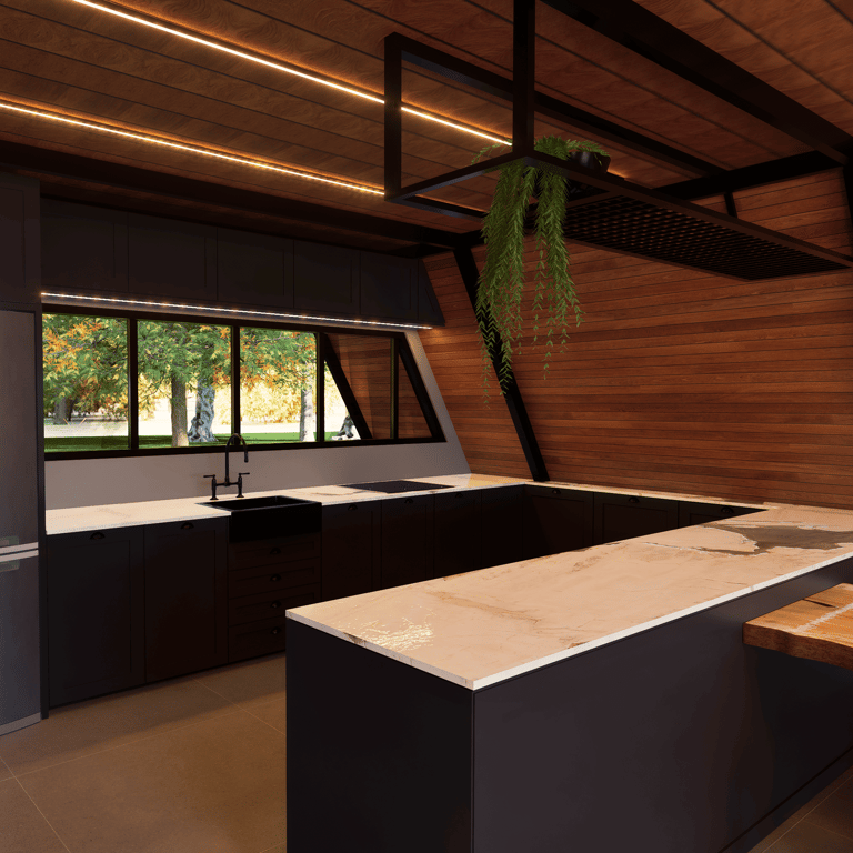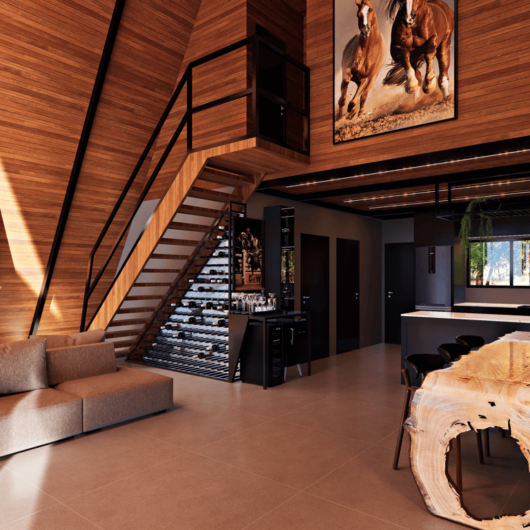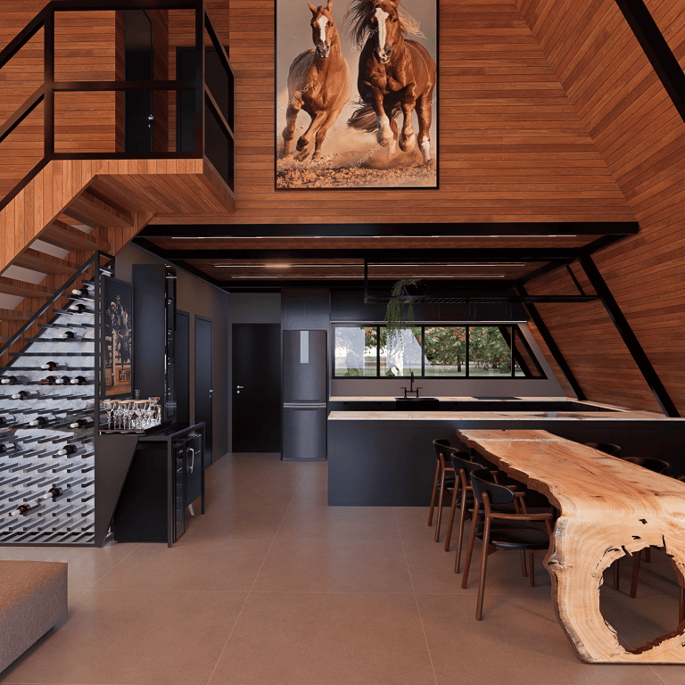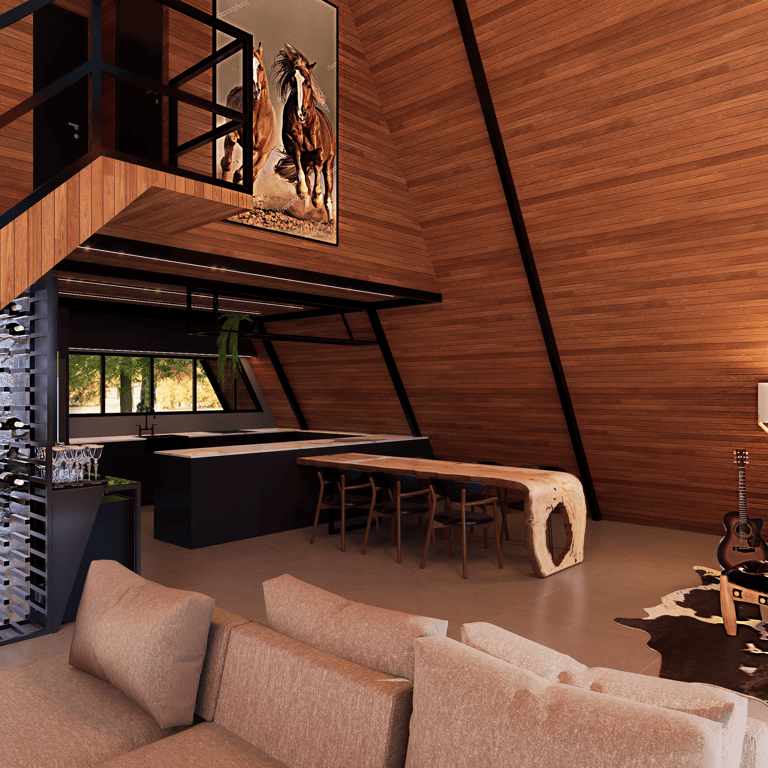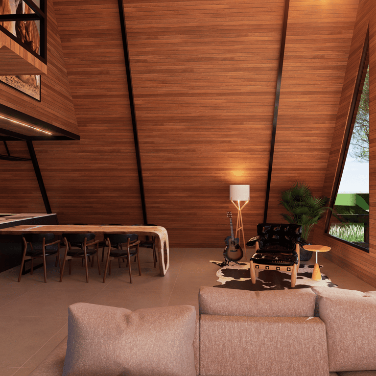 Cabana com arquitetura compacta e acolhedora, pensada para integração com a natureza e experiência de refúgio. Estrutura em madeira aparente, grandes aberturas para luz natural e paisagem, além de soluções térmicas e funcionais que priorizam conforto em um espaço reduzido e envolvente.