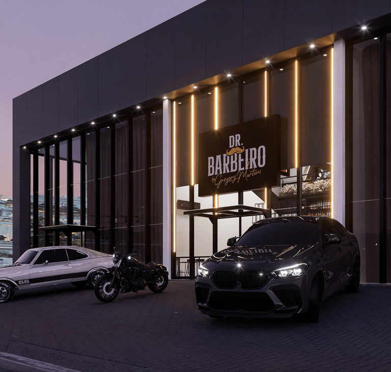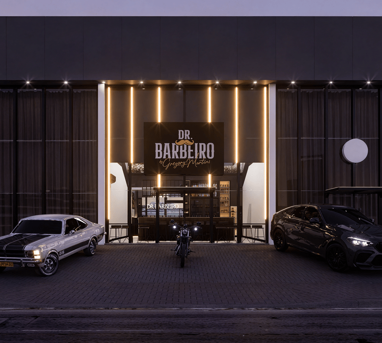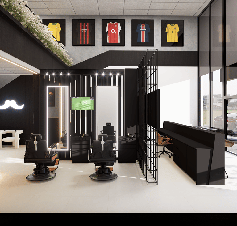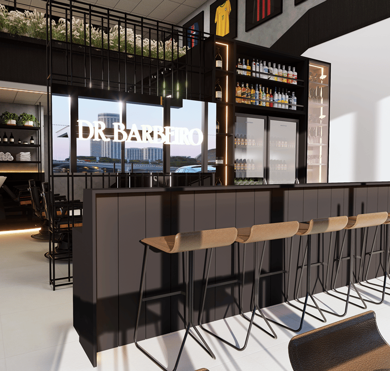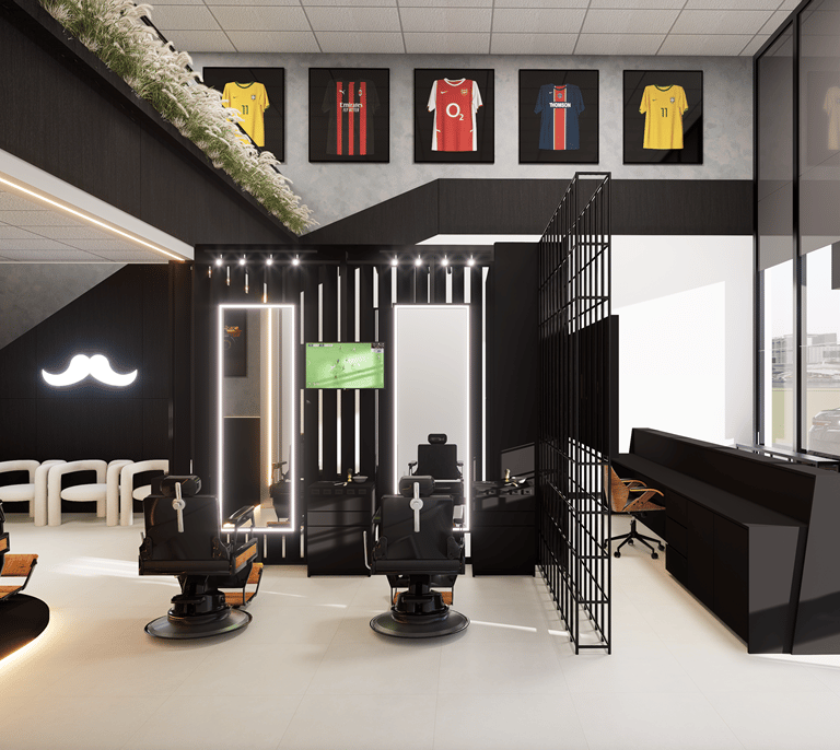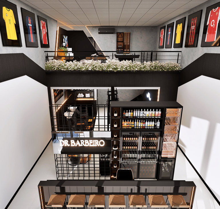 Barbearia de alto padrão com 180m², layout centralizado com ilha de atendimento para barbeiros, otimizando o fluxo e a funcionalidade do espaço. Projeto contempla lounge de bebidas integrado à recepção, mezanino com área de jogos e estilo industrial com uso de cimento queimado, metalon e MDFs escuros.