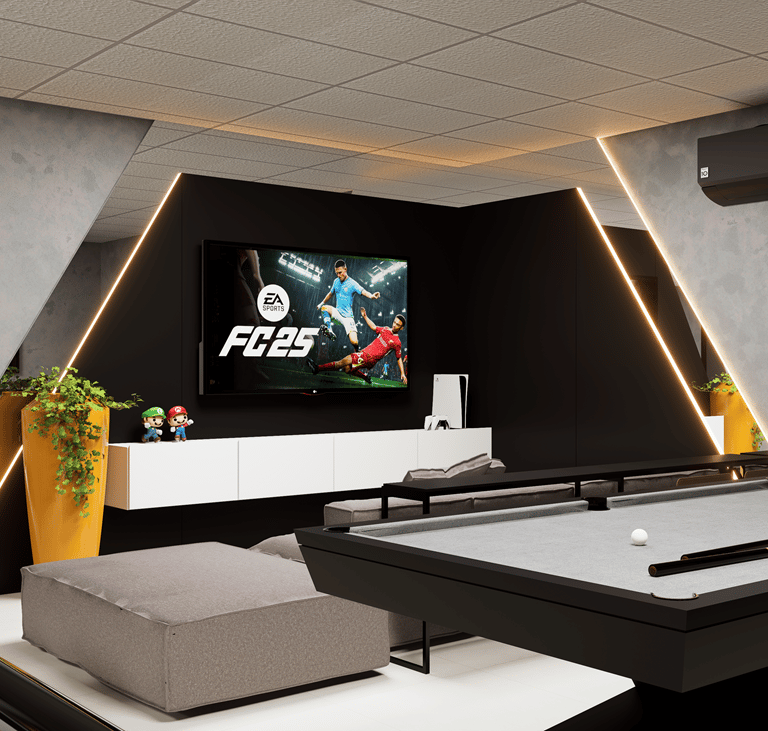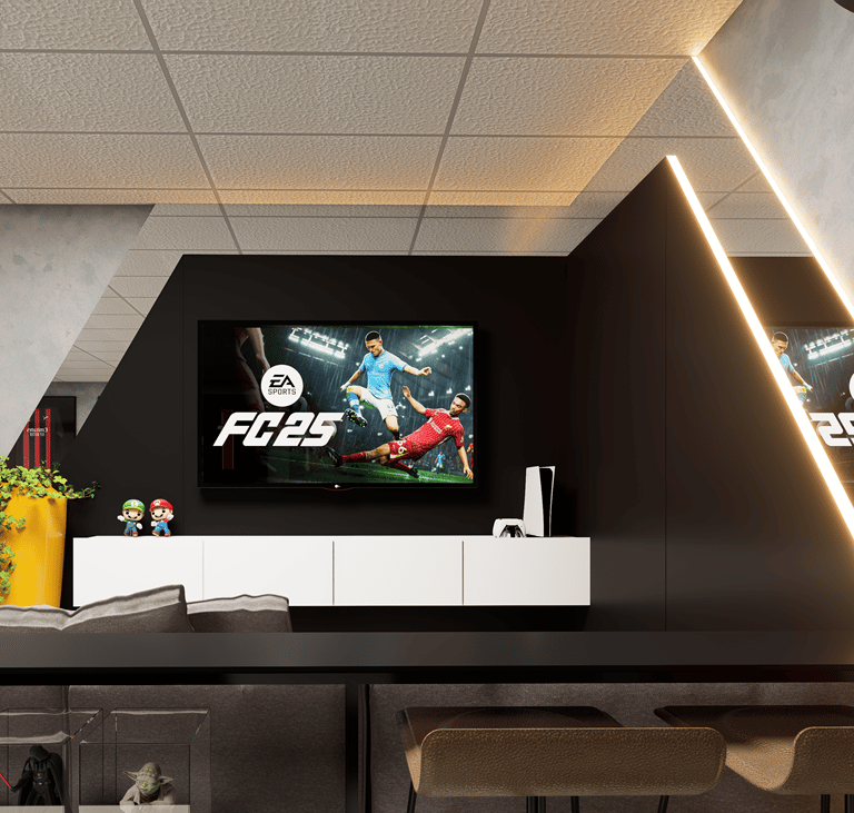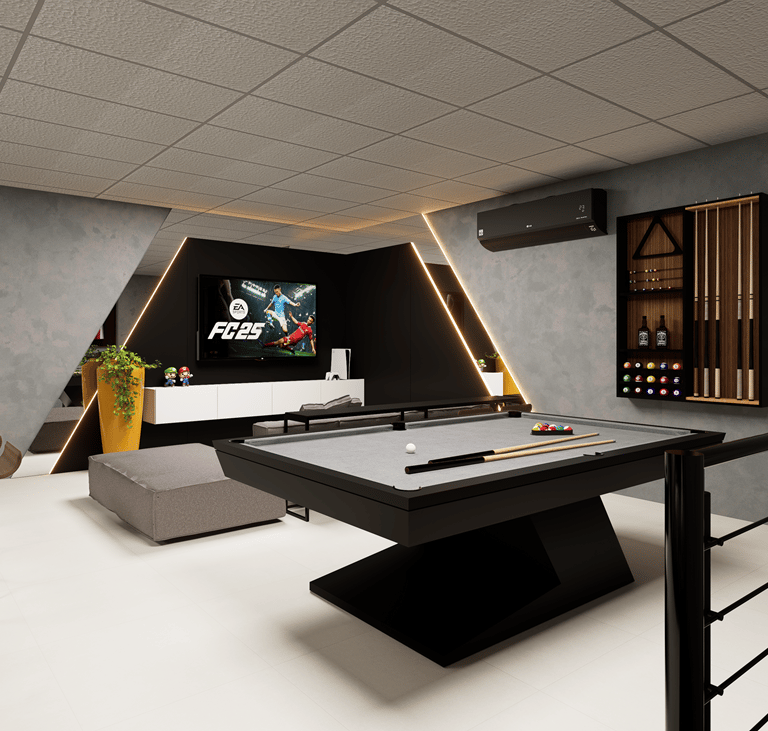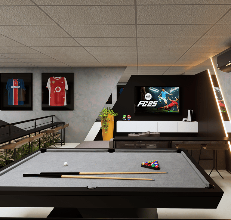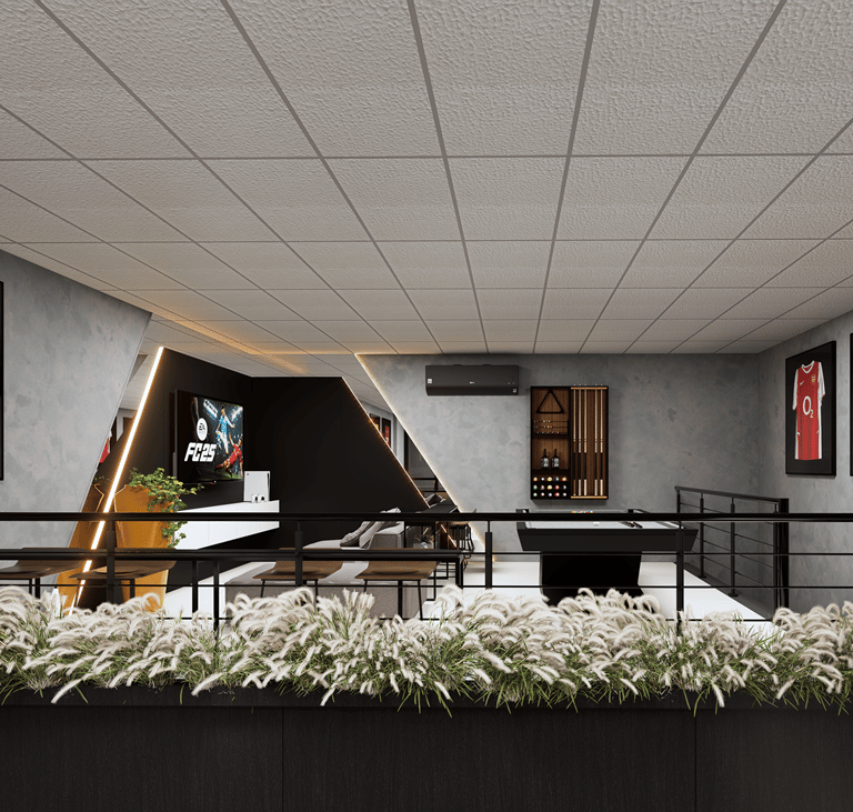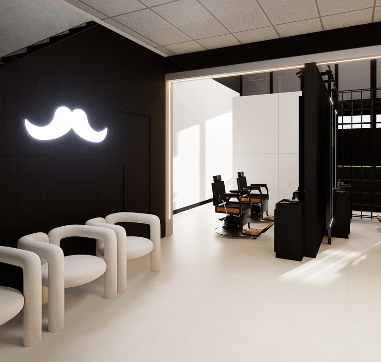 Barbearia de alto padrão com 180m², layout centralizado com ilha de atendimento para barbeiros, otimizando o fluxo e a funcionalidade do espaço. Projeto contempla lounge de bebidas integrado à recepção, mezanino com área de jogos e estilo industrial com uso de cimento queimado, metalon e MDFs escuros.