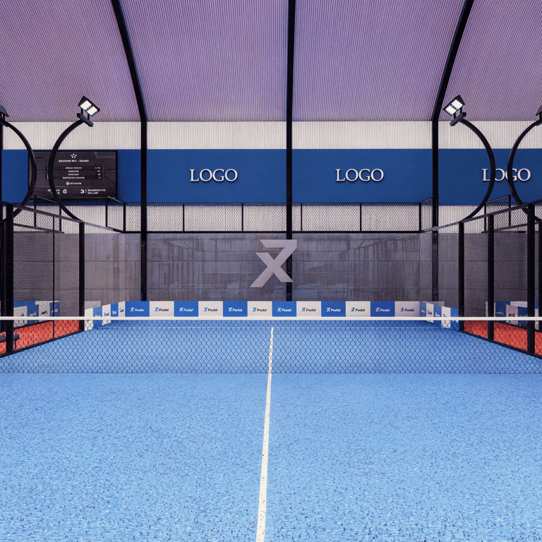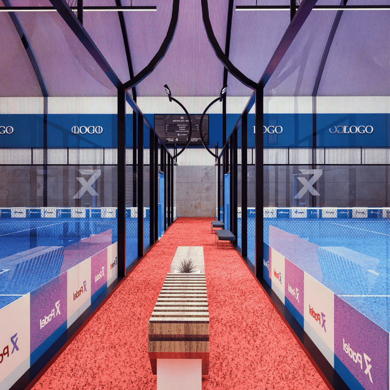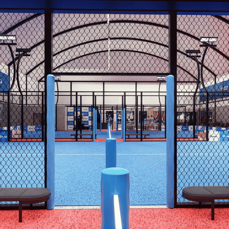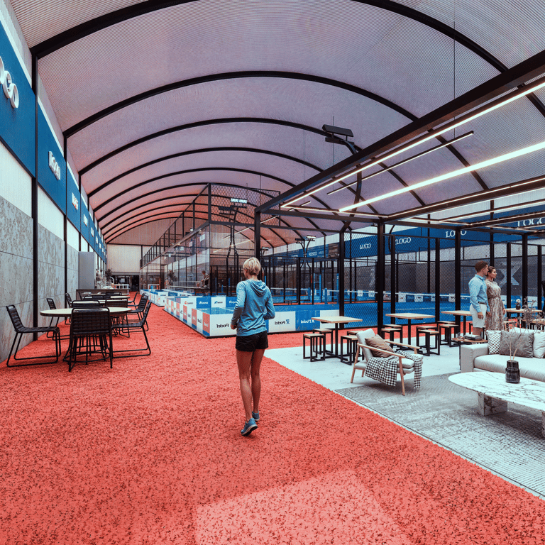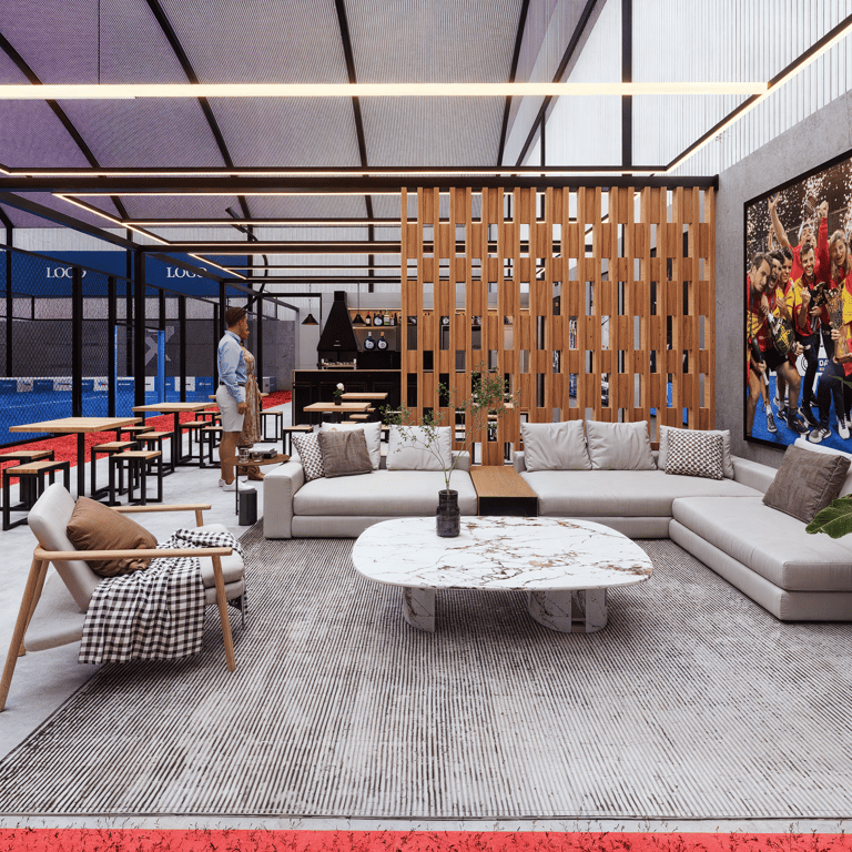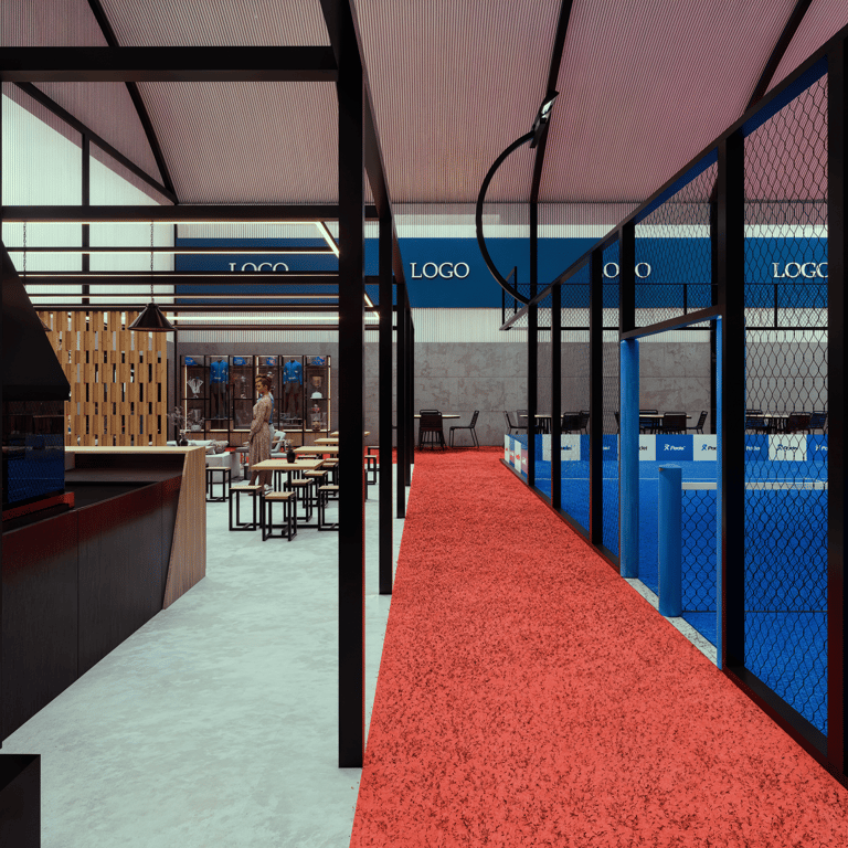 Complexo esportivo de 450m² com 4 quadras de padel, áreas de lounge, arquibancada para campeonatos e vestiários completos. O projeto valoriza a experiência do usuário com ilhas de churrasqueiras distribuídas estrategicamente, promovendo integração social em eventos e partidas casuais. Layout dinâmico e funcional, com identidade visual esportiva e contemporânea.