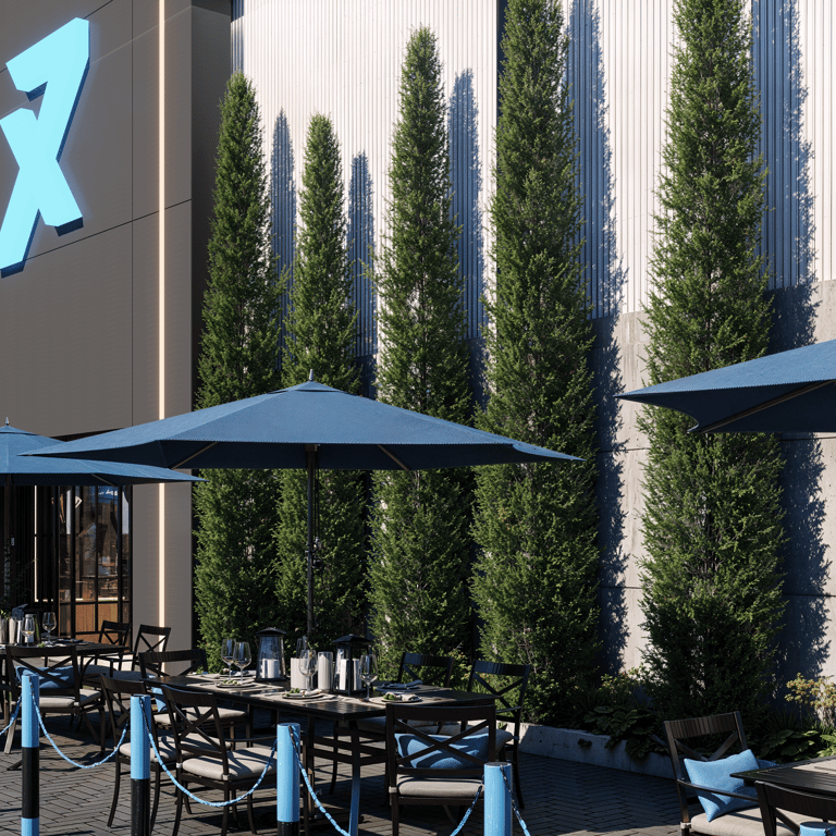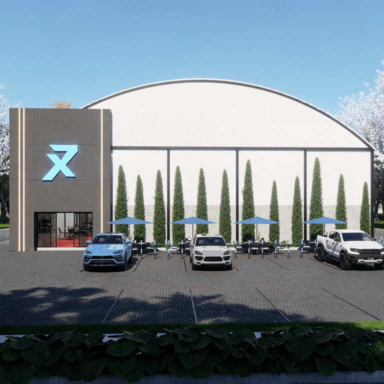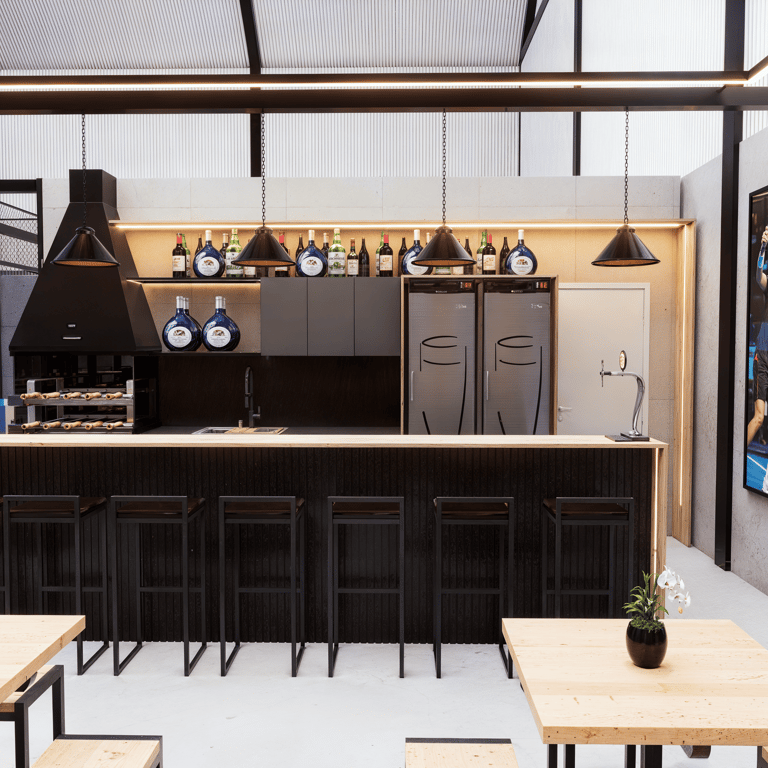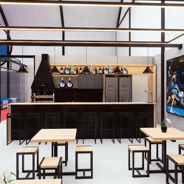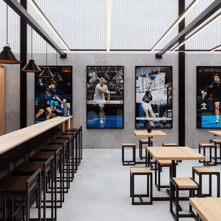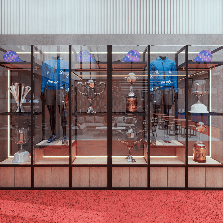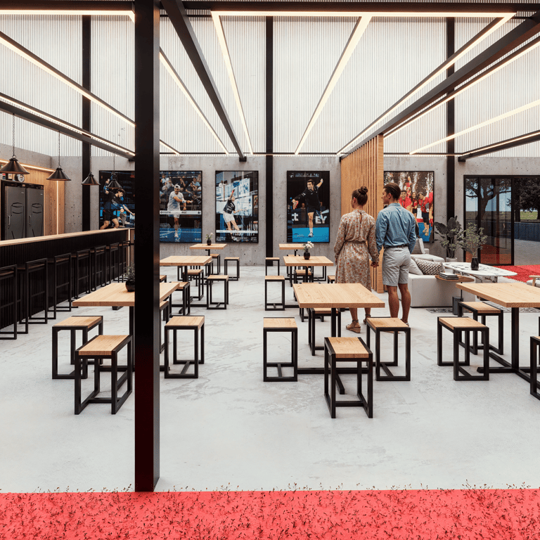 Complexo esportivo de 450m² com 4 quadras de padel, áreas de lounge, arquibancada para campeonatos e vestiários completos. O projeto valoriza a experiência do usuário com ilhas de churrasqueiras distribuídas estrategicamente, promovendo integração social em eventos e partidas casuais. Layout dinâmico e funcional, com identidade visual esportiva e contemporânea.